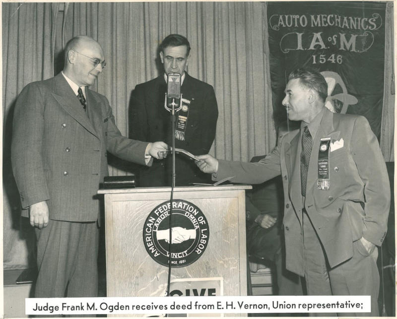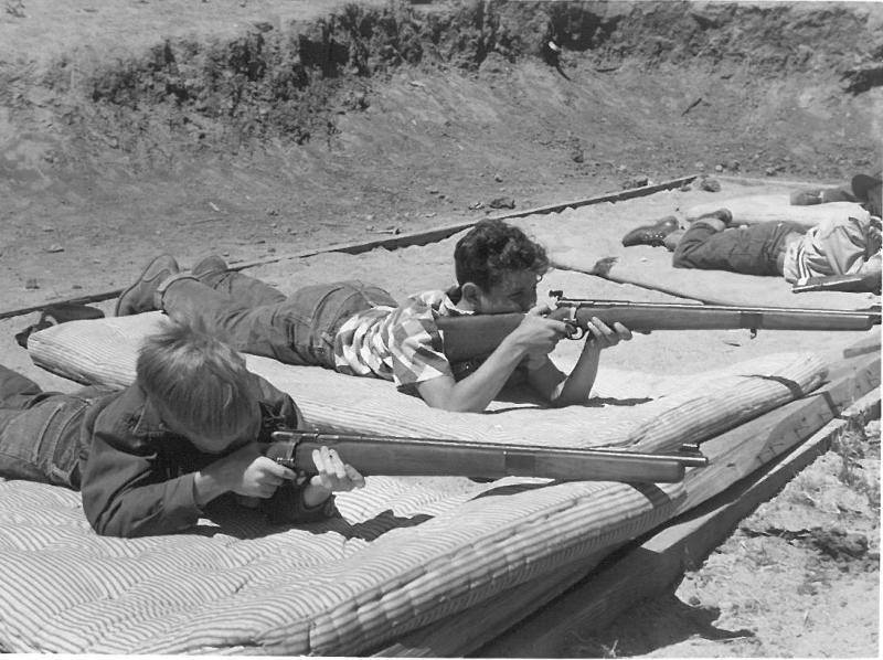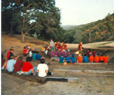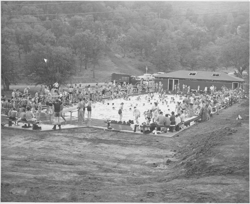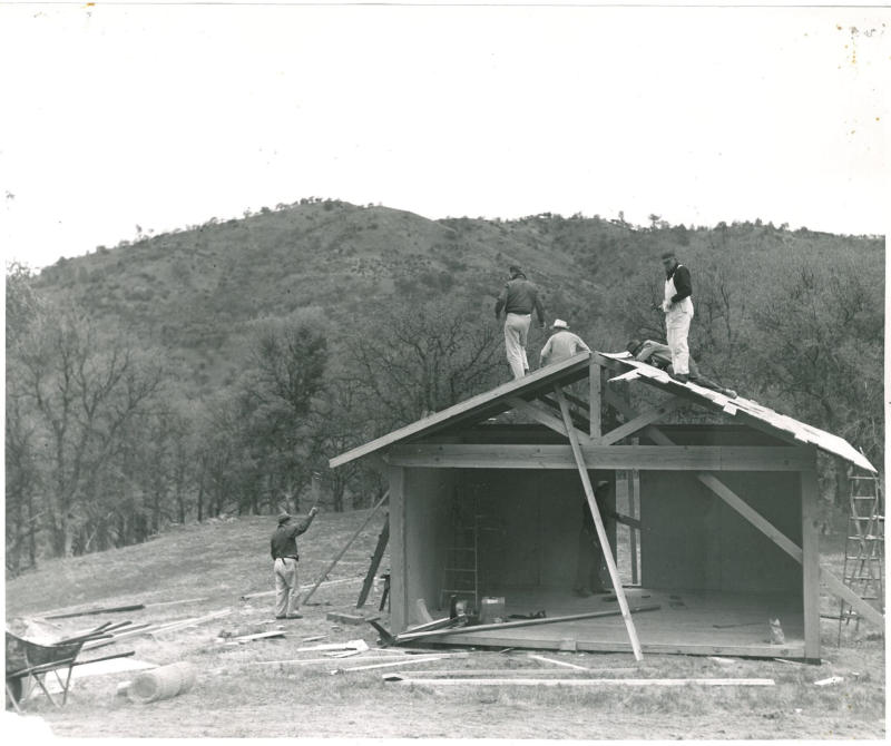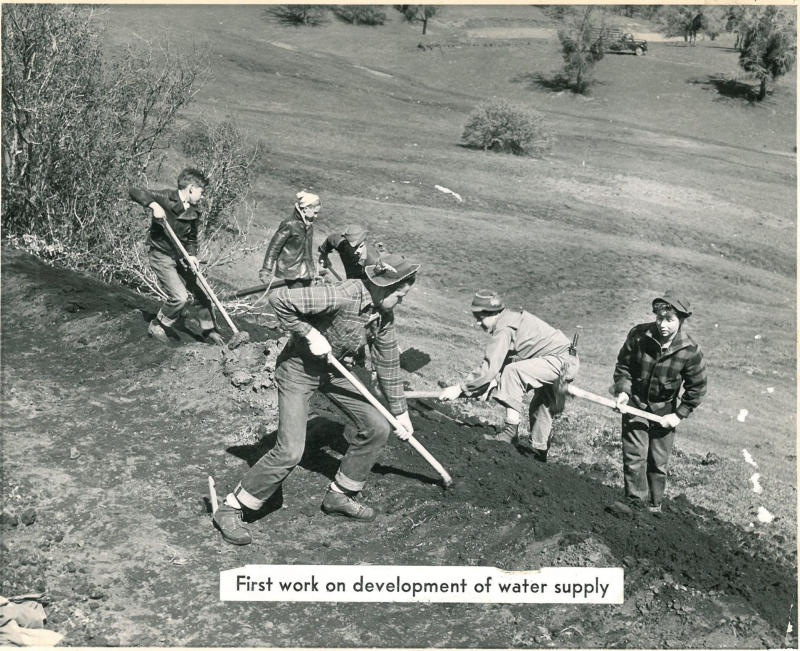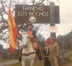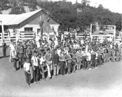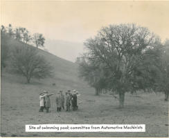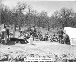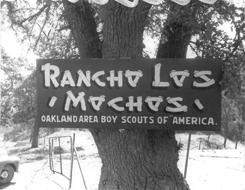 The Land Before Los Mochos (Oakland Tribune June 11, 1944): The Sweetwater springs spot derives its name from a collection of some 20 or 30 springs oozing water, which has a slightly sweet taste. All of the water is potable, and the springs never run dry, seepage making marshy ground of the hillside. Used only as grazing land for cattle and sheep, it exists today exactly as it was left by the Indians. A few of the springs have been cleared to provide water for livestock, but otherwise the Scouts have the opportunity of camping in virgin territory. The Sweetwater was not included in any of the old Spanish and Mexican grants, and it had always been Government land. When the Central Pacific railway was being built in the late 1860's, a Government grant gave every odd-numbered section within 20 miles of the railroad to the builders, and the Sweetwater became "railroad land." As such it was not available for private ownership, and the railroad did nothing more than lease it for grazing. Some years later the railroad company traded its holdings in the Livermore mountains to the Crocker-Winship estate, in exchange for railroad properties, but the status of the land, for development purposes, did not change. Los Mochos History (From the camp dedication on June 7, 1953): Rancho Los Mochos, 686 acres of wilderness virgin land, located 19 miles southeast of Livermore, is the gift of the Automotive Machinists Union No. 1546, International Association of Machinists. This campsite was first visited by the Jesuits in 1776 under the leadership of Father Pedro Font. The centuries that followed found it the campground of Indian Tribes inhabiting Alameda County, who came to partake of its mineral impregnated water, considered by them to have great medicinal value. The campsite was not a part of the old Spanish Grants of Alameda County, but was known as "railroad land." It was one of the sections transferred by the Federal Government to the Central Pacific, now the Southern Pacific Railroad, as part of the grants to railroads for road building in 1860. The property remained in the possession of the railroad for many years later it was transferred to the Crocker Winship Estate (Crocker being one of the early Presidents of the Southern Pacific). The land was purchased from the Crocker Winship Estate by the Automotive Machinists Union No. 1546, and the deed for the land was presented to the Oakland Area Council, Boy Scouts of America, on March 6, 1945. Rancho Los Mochos is dedicated as a memorial camp. With the acquisition of the property steps were taken by the Council under the direction of Judge Frank M. Ogden President, Howard Ainsworth - chairman of the Camping & Activities, and the Physical properties Committee headed by Walter McLean, to make a master plan for use of the camp. Through the cooperation of engineers, mechanics, architects and the entire community the master plan was evolved and approved by the Board of Directors and the first step in the construction was started. The campsite when first acquired had no roads and only cattle trails. Through the cooperation of the United States Navy Sea Bees the road into camp was constructed. Following the construction of the road the installation of a water system was the first order of business. Campsites were laid out, sanitary facilities set up and the policy of maintaining Rancho Los Mochos as a wilderness camp was established by the Council. An administrative training area, which includes a swimming pool, shower house, warehouse, garage, caretaker's lodge, training center and Teel Lodge was set up as a unit around which the functions of the camp would revolve. Construction of each of these buildings required the cooperation of Management and Labor in providing materials and man power to bring them into being. The camp represents a mixture of the old and new, for there was brought into the camp, as part of its permanent facilities, the Kiwanis building from Camp Dimond in Oakland. The Kiwanis building which was formerly used as the first aid center and later as the Council Office, was cut into three pieces and moved from Camp Dimond up to Los Mochos. The building was reconstructed is being used as the caretaker's lodge. Thus the gift of the Oakland Kiwanis Club was kept intact for future generations of Scout service. The cooperation extended to the Council by the various Unions of the American Federation of labor marks one of the outstanding cooperative activities ever engaged in by this Council. Hundreds of skilled mechanics gave untiringly of hours and service in providing manpower to erect the building and facilities in the camp. Likewise, contractors, equipment handlers and dealers in building materials contributed generously toward supplying the necessary materials for the construction work. Teel Lodge is dedicated to the memory of Mary L. Teel, who served the youth of San Lorenzo, Hayward and Southern Alameda County as friend and advisor during her entire lifetime. In 1942, several years before her death Miss Teel presented to the Oakland Area Council a piece of property in the San Lorenzo area which became known as Camp Meek. In the years that followed it became evident that the best interest of the Boy Scouts of America would be served by disposing of this property and applying the proceeds to a permanent memorial to Miss Teel. With consent of her friends the property was sold and Teel lodge at Rancho Los Mochos is the result of this action. It is dedicated in perpetual memoriam to Miss Teel's interest in youth. The outdoor chapel building, located on the hill above the activity field, built by the Oakland Kiwanis club, is evidence of the continued interest of this Organization in the youth of our community. Contributions of other Service and Fraternal Organizations have been pooled and made possible the installation of special facilities in the pool and other areas in the camp. The Oakland Area Council, Boy Scouts of America, its thousands of 